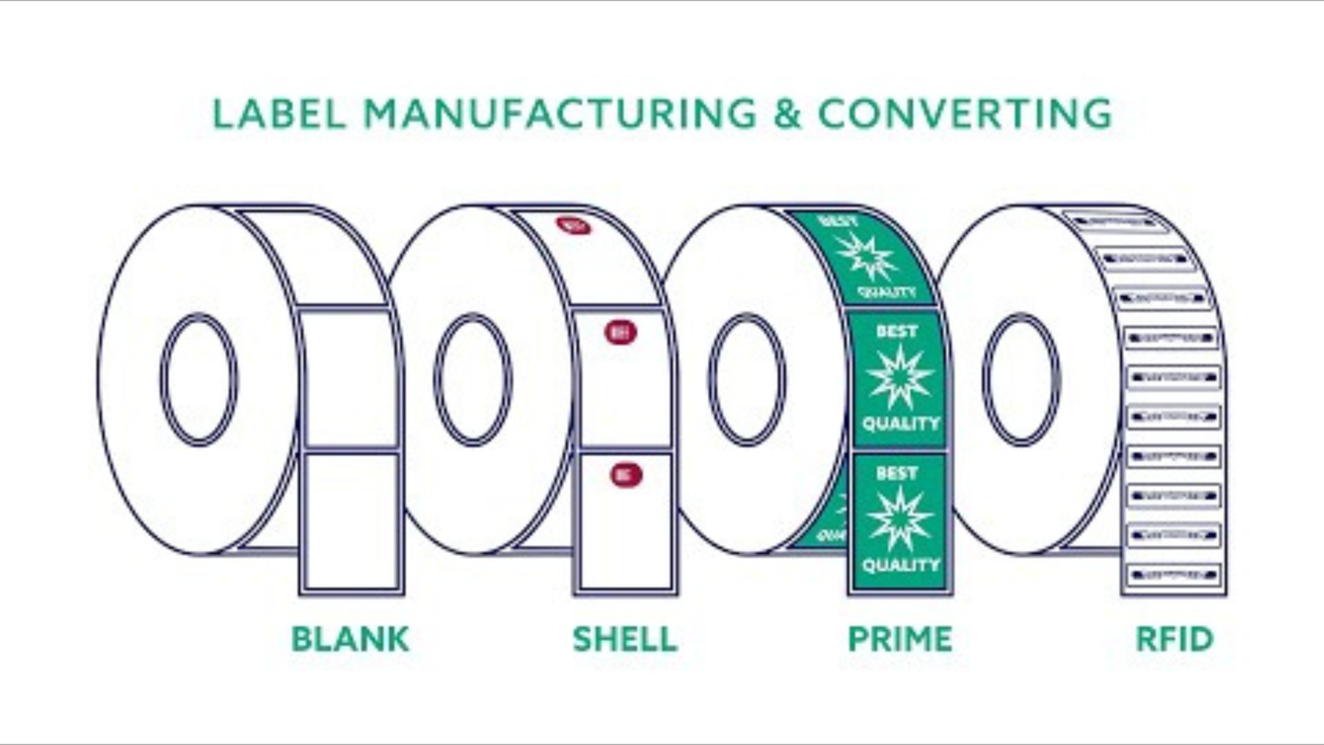 In-house label conversion, printing, and finishing with high-end machinery, including 4-color printing machines and multiple punching machines.